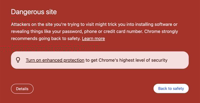 A red interstitial in Chrome that says the site is harmful or deceptive